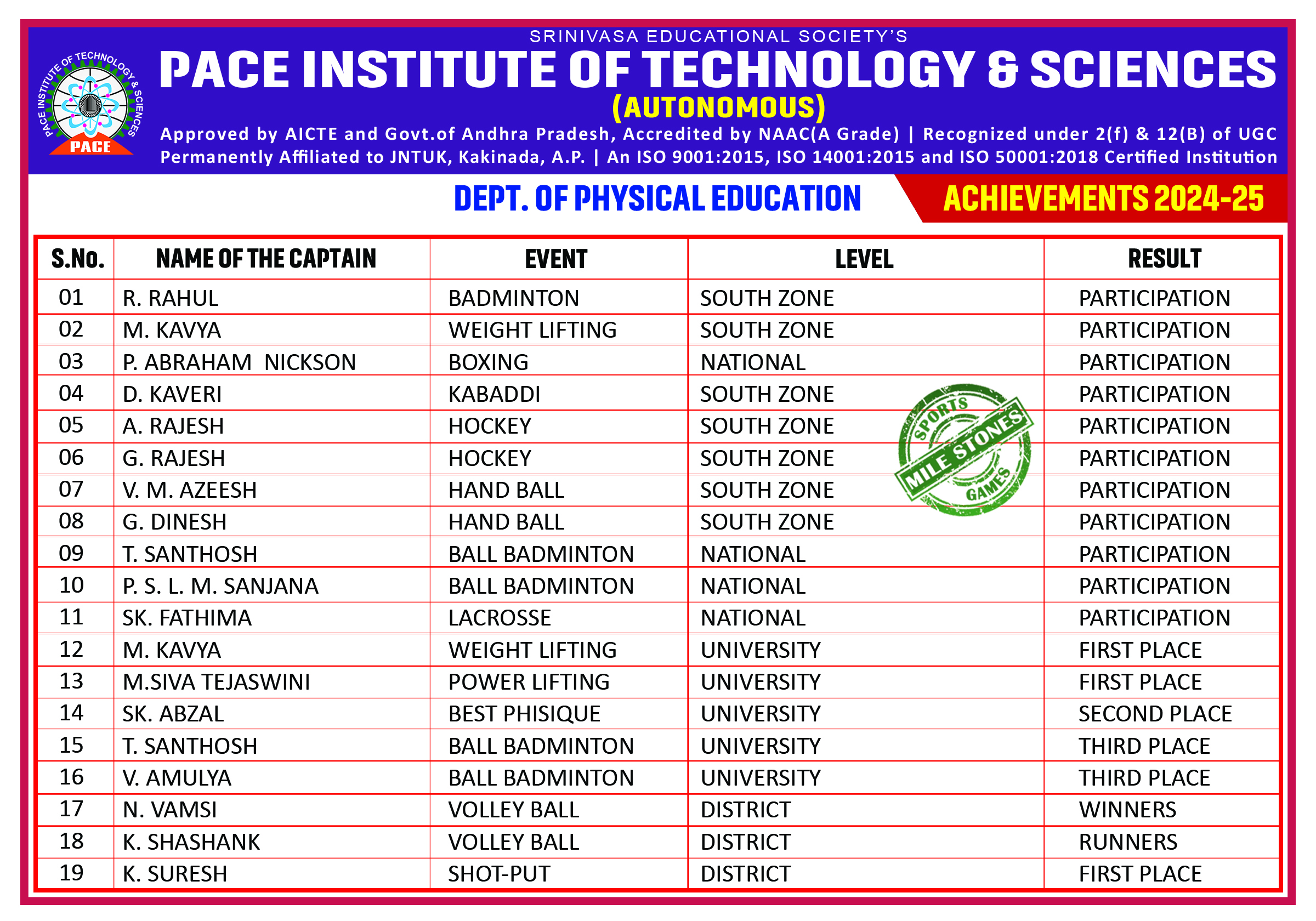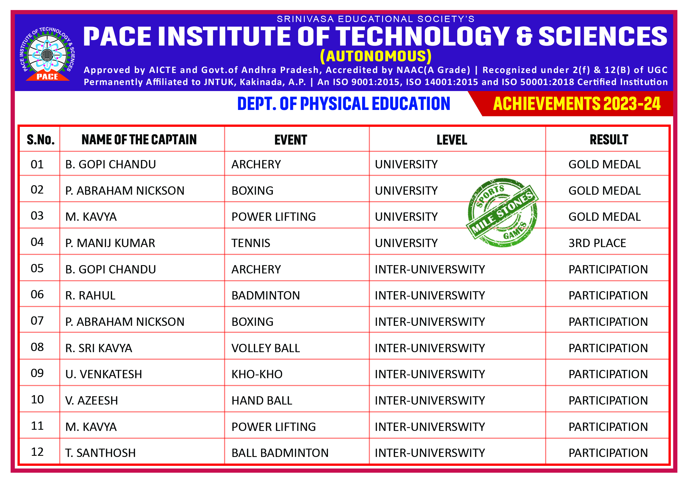 The sports and games achievements echo that PACE is genuinely committed for the comprehensive development of the students. The Institute has a huge play ground, basket ball court, indoor games room and valuable sports equipment. Students energetically participate in intercollegiate, district level and university level games. Students were selected for JNTUK sports and games teams.